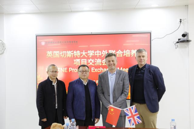 3月19日下午,学院与英国切斯特大学在敬业楼202会议室召开中外联合培养项目交流座谈会。共青城市副市长余毅,学院院长毛小兵,党委书记黄黑平,副院长丁美东、副院长陆宇海,英国切斯特大学副校长(国际)、人文与社会科学艺术学院行政院长大卫・麦克拉维,副校长、科学、商业与企业学院行政院长柯特・奥尔曼,英国切斯特大学中国及亚太主任武虹辰,中国办公室副主任、校友徐凡出席会议。会议由陆宇海主持。